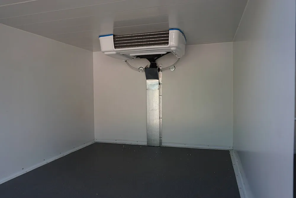 Привод от двигателя автомобиля. Отбор мощности через ременную передачу, фреон R404, пульт и управление в кабине водителя, компрессор 5H11, автоматическая и ручная разморозка. Дополнительно: монтаж отдельного автономного отопителя для требовательных грузов.